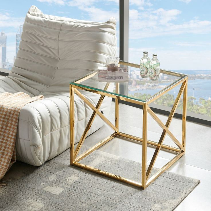 این میز کنار مبلی خاص با طراحی مدرن و هنری، ترکیبی چشمنواز از جلوهی طلایی لوکس و هندسهی خلاقانه است که در نگاه اول چشمها را خیره میکند.